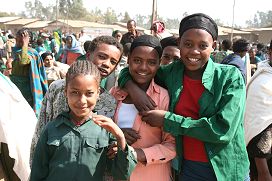 Gondar ligt in het hart van een bergachtig gebied op zo'n 2225 meter hoogte. Vanwege de gunstige ligging, op een kruispunt van drie karavaanroutes, het aangename klimaat en de vruchtbare grond werd Gondar bestemd tot de hoofdstad van de koningen van Ethiopië in de 17e en 18e eeuw. Onder het bewind van Fasilades (1632-1667) maakte de stad een bloeiperiode door. De koning herstelde het traditionele koptisch geloof en gaf de opdracht tot de bouw van vele kerken en kastelen waarbij architecten Portugese, Indiase, Moorse en Ethiopische stijlen combineerden. In de middag arriveren we in Gondar. In Gondar en daarbuiten wonen veel christelijke Amharen die tot in de tijd van keizer Haile Selassie een leidende rol speelden in de maatschappij. Daarnaast vindt men een even grote groep islamitische Oromo. Gondar was eeuwenlang de hoofdstad van het christelijke Ethiopië. Nu zijn een belangrijk deel van de huidige inwoners Moslim. We zien ook aardig wat moskeeën. We dwalen wat door de kleine straatjes, die er erg vies uitzien. Je ziet dat hier veel meer moslims wonen. Opeens word ik staande gehouden door een oude man die mijn hand kust. De groene bonen waar veel mensen hier op kauwen heten sinbra. Het wordt alleen in deze periode van het jaar gegeten. Dag 7 Gondar