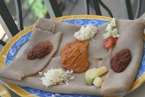We gaan met een taxi naar het Hilton hotel om geld te wisselen. Onze tassen moesten door een scanner en wijzelf worden ook gescand voor we naar binnen mogen. We wisselen 300 birr voor 3 pakketten van 100 1 birretjes voor de foto’s die, later in de reis, betaald moeten worden. Het is nu kerstavond hier. Ethiopiërs vieren 'Genna' of 'Leddet' (Kerstmis) op 7 januari. Kerstmis is voor de Ethiopiërs niet zo'n belangrijke feestdag als voor ons. Het Orthodox geloof besteedt meer aandacht aan Maria en de dood heeft een belangrijkere rol dan de geboorte. Op kerstavond christenen naar de kerk waar een speciale dienst wordt gehouden. Alle Ethiopiërs gaan naar de stad en de markt om een geit te kopen. Het is de gewoonte om met je familie met kerst een geit te eten. Je ziet dan ook veel mensen met een (soms onwillige) geit lopen. Ze worden dan aan de voorpoten meegesleept. Ook wordt er veel gras aan de kant van de weg verkocht. Dit strooit men op de vloer en staat voor welkom en gezelligheid. We gaan allereerst naar de dichtstbijzijnde supermarkt en kopen daar een spuitbus tegen vlooien. De meisjes in de winkel, die een kerstmuts dragen, hebben grote lol om onze pogingen duidelijk te maken dat we een vlooienspray willen hebben. Maar uiteindelijk verlaten wij helemaal tevreden de winkel met de spuitbus onder de arm. Wij gaan vanavond eten in een Ethiopisch eethuisje. Ook hier ligt het gras op de vloer. Elke maaltijd begint met het wassen van de handen. Er wordt geen bestek gebruikt. De basis van iedere maaltijd is injerra, een zurige, grauw kleurige, grote pannenkoek. Deze is gemaakt van teff, een fijn graansoort wat in Ethiopië wordt verbouwd. Teff is een graan, dat in heel Ethiopië als tarwe wordt geteeld, maar dat in andere landen als veevoer wordt gebruikt. Er zijn twee soorten teff: rode (die rijker is aan ijzer en mineralen) en witte, en die zijn verantwoordelijk voor de plaatselijke verschillen in de kleur van injera. Daarbij wordt wot, een vlees-, kip-, of groentesaus gegeten. De saus is (erg) pittig gekruid met berbere, een mengel van rode peper en andere kruiden. Soms kun je ook tibs, (gebakken, klein gesneden en mild gekruid, lams- of rundvlees) en kippicato, (kleine stukjes gebakken kip) tegenkomen.