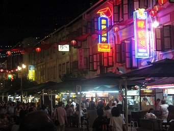 ´s Avonds is er een streetparade. Dit wordt ieder jaar gedaan op de zaterdag na het Chinees nieuwjaar. We treffen het dus. het thema dit jaar van de geit is: de oceaan van de harmonie. Lokale en internationale performers bundelen hun talenten samen en maken er iets moois van. We zien zee figuren in allerlei vormen voorbij komen. De straat is veranderd in een zee van kleuren. We lopen wat rond en komen dan toevallig uit bij de quark Quai. Het is hier erg duur, maar erg gezellig. Aan de andere kant ligt de Boat Quai. Hier zijn food stalls, terrassen en uitzicht over de haven. Het is iets rustiger en goedkoper. Hier gaan wij maar een hapje eten. Je koopt bij ieder tentje wat. We nemen een gevuld broodje en saté stokjes. De laatste vergeten we te betalen. Het broodje wordt bij de tafel afgerekend. Het drinken betalen we ook. Als we weg lopen komt er iemand hard achter ons aan rennen. De saté stokjes moeten nog betaald worden. We komen er achter de jeukbulten, die we plotseling in Cambodja kregen, niet van de muggen, nog van de zandvlooien komen. Het is netelroos. Dit treedt op als een allergische reactie op Malerone. Dit slikken we als anti-malaria middel. Volgens de bijsluiter kan dit gebeuren. Het zal nu wel snel overgaan. Malarone slikken we niet meer. We gaan naar China town. Het is een aardig eindje lopen naar de South Bridge road. . We komen eerst langs een IT shopping mall. We zien hier erg veel leuke dingen, waar we hebberig van worden. Vooral de nieuwe notebooks van sony zijn superklein, 2 keer zo groot als mijn osaris en weegt maar 1,2 kg en is erg plat. Er is zelfs een cameraatje ingebouwd. Erg mooi. Maar voor ons te duur. Bert wil weg. Hij is er flauw van. We kopen wel een trekkarretje voor de rugzak. Om te proberen of het handig is. Sri Mariamman Tempel bekijken. Het is een veelkleurige hindoe tempel. Met een toren van standbeelden boven de ingang. We vinden het erg mooi. De winkeltjes hebben hier een soort veranda. Als je op de stoep loopt, moet je steeds een stapje omhoog of omlaag. Ook hier weer een markt. We dwalen wat door de leuke straatjes. We voelen ons even weer in China. We gaan met de metro naar Orchard road terug. En wie Orchard Road zegt, zegt winkelen. In deze winkelstraat, waar ons hotel ook staat, bevinden zich ontelbare winkelcentra met verdieping na verdieping winkels. Mode, parfum, sieraden, elektronica, schoenen enz. enz. enz. Je vindt het er allemaal. Nadat we enkele winkelcentra hebben bezocht,houden we het voor gezien. Door het vele lopen en vooral de warmte zijn we erg moe geworden en in het centrum wacht een heerlijk hotel op ons. We hebben geen zin meer in de night safari naar de dierentuin. De avond brengen we dan ook gedeeltelijk in het zwembad en in het heerlijke zachte bed door. Lekker genieten van al de luxe.
